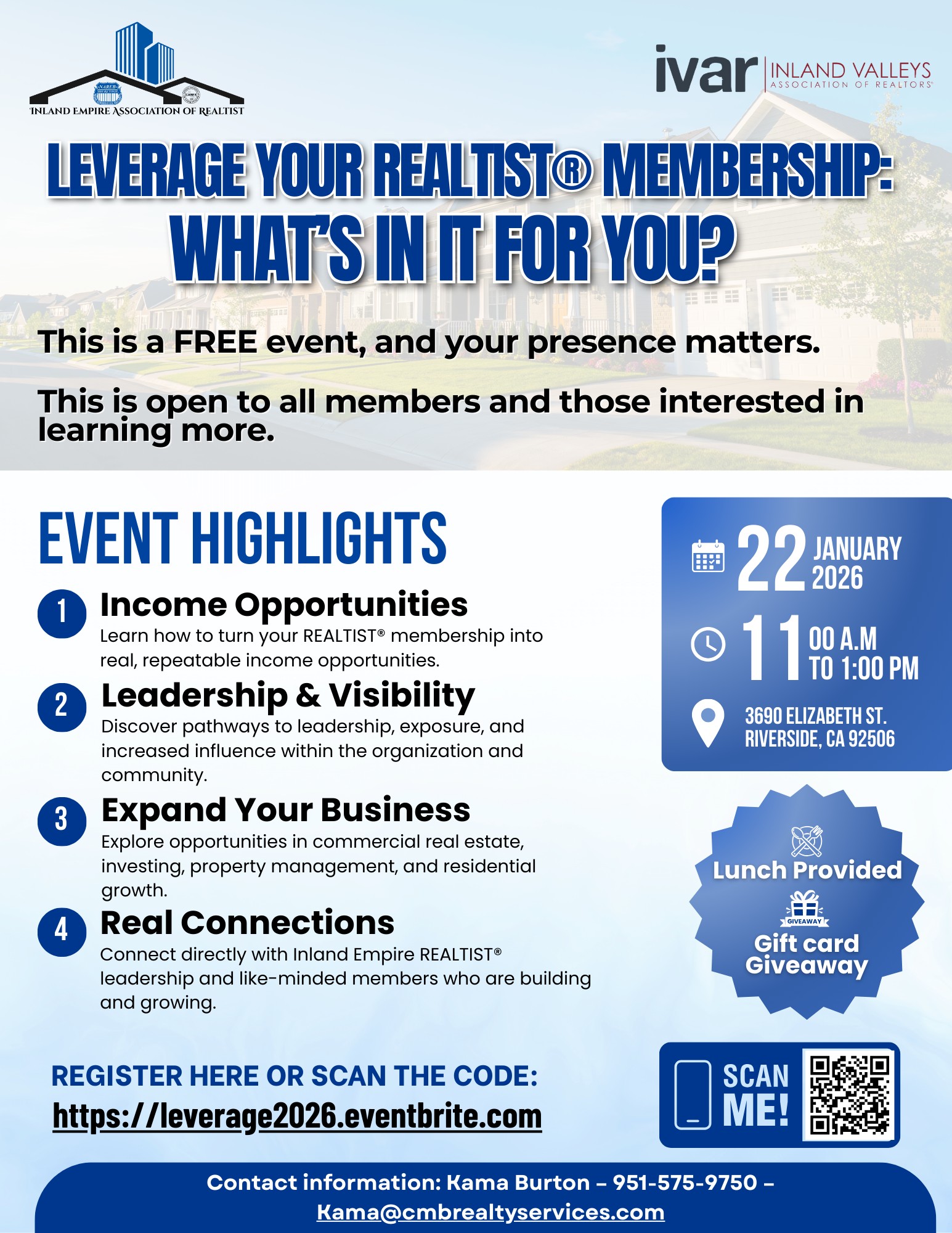 IVAR Riverside 3690 Elizabeth Street, Riverside, CA, United StatesAll newly instated REALTORS® have 60 Days to attend orientation from their activation and 30 days from their activation to complete Code of Ethics requirement (which is due every 3 […]
