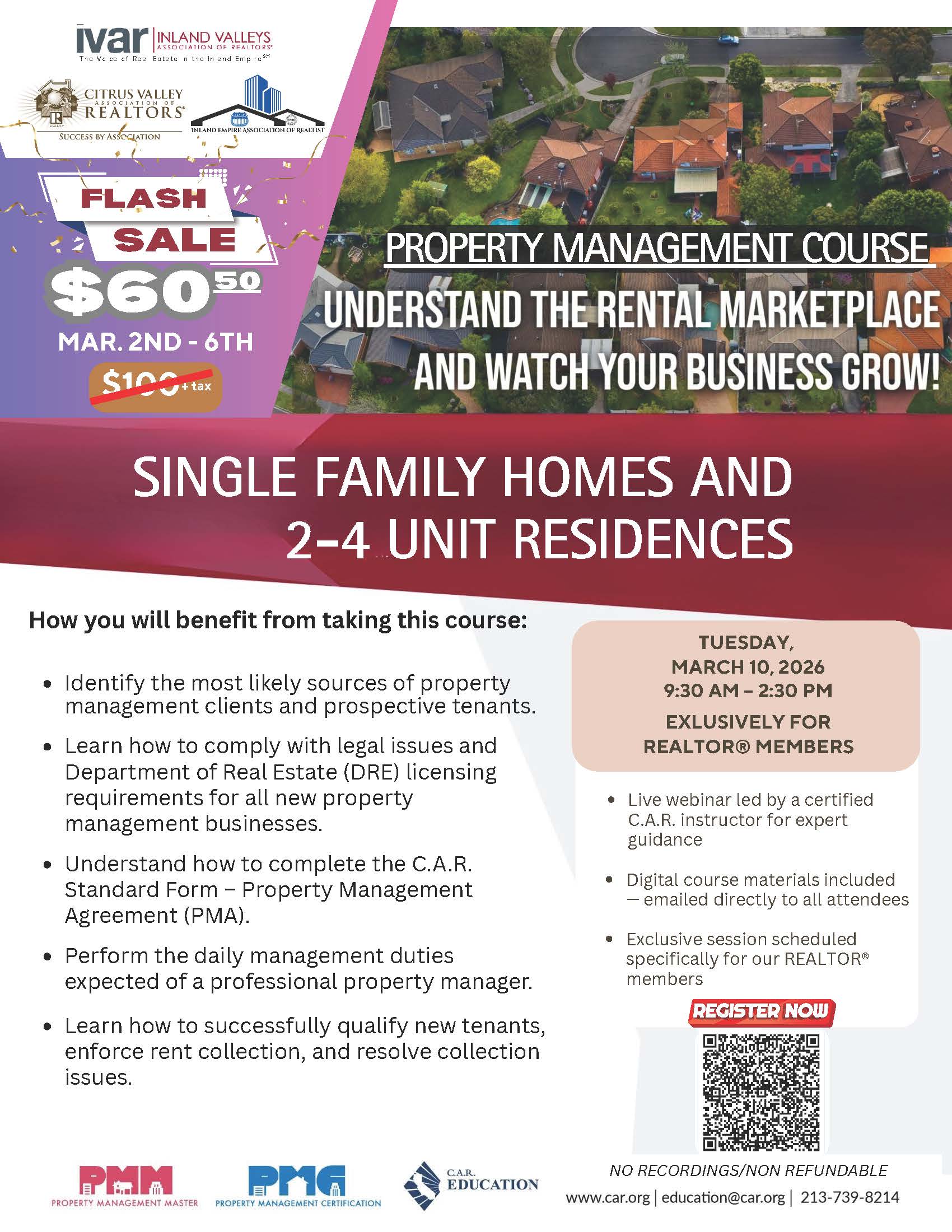 Zoom WebinarTHIS IS A LIVE COURSE VIA ZOOM FOR IVAR MEMBERS CLICK HERE TO REGISTER THIS CLASS IS CREDITED TOWARDS THE PROPERTY MANAGEMENT CERTIFICATION . CLICK HERE FOR MORE INFORMATION